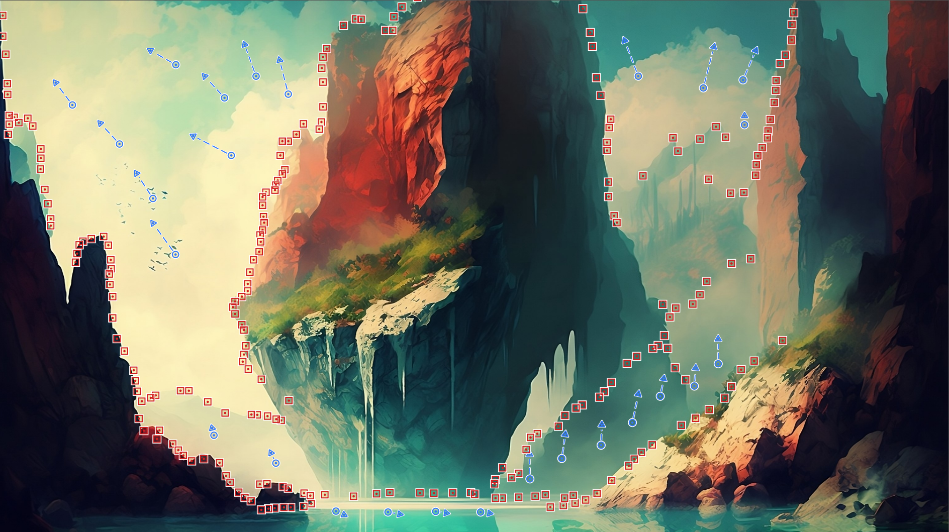 When you’ve selected one of the Animation tools, you can then click around on your image to create movement or stationary areas. Movement areas (created using the Animator) will appear on the image as a blue arrows with a circle start point and an arrow depicting direction of movement. Stationary areas (created using the Block) will appear as a red square dot.